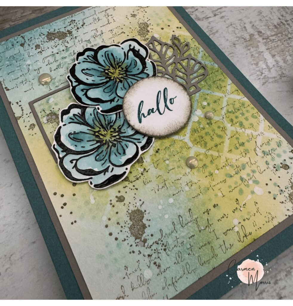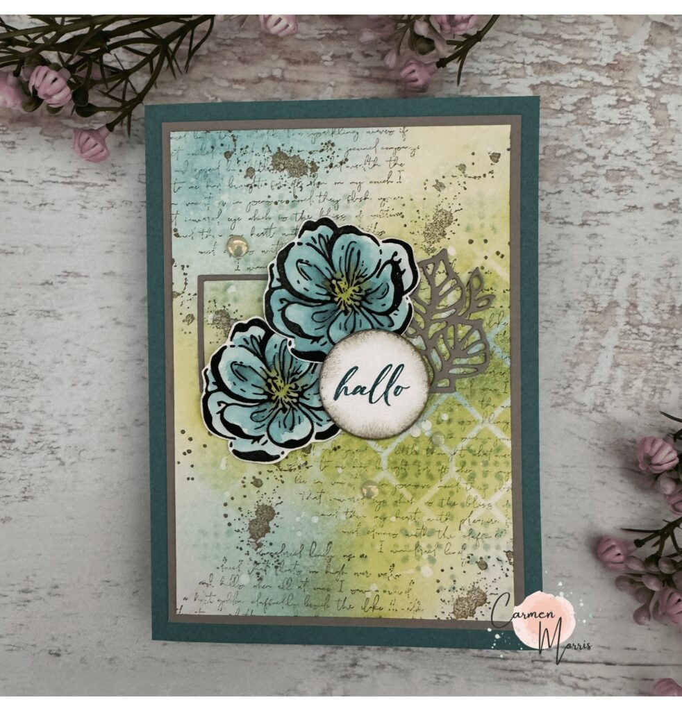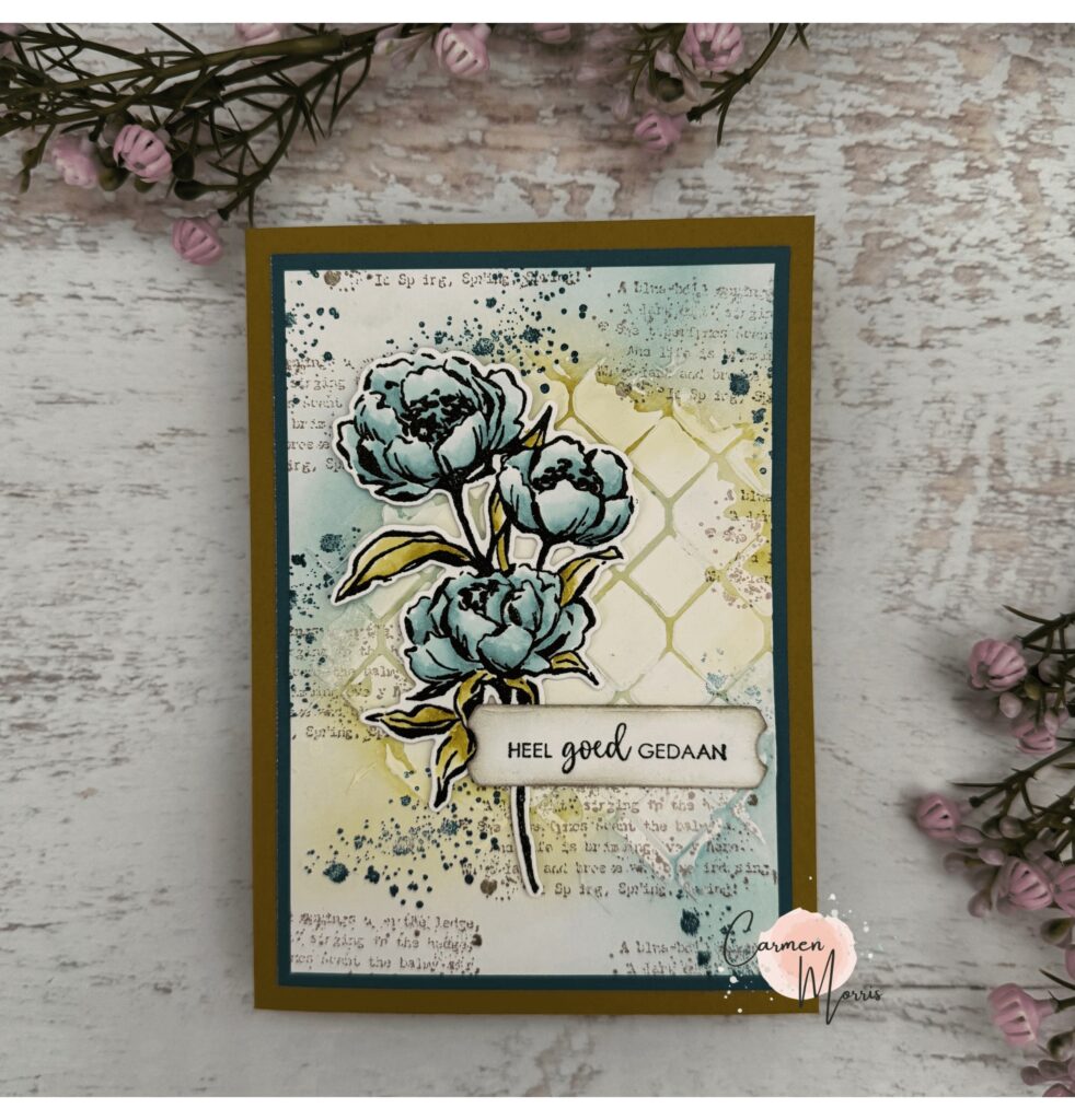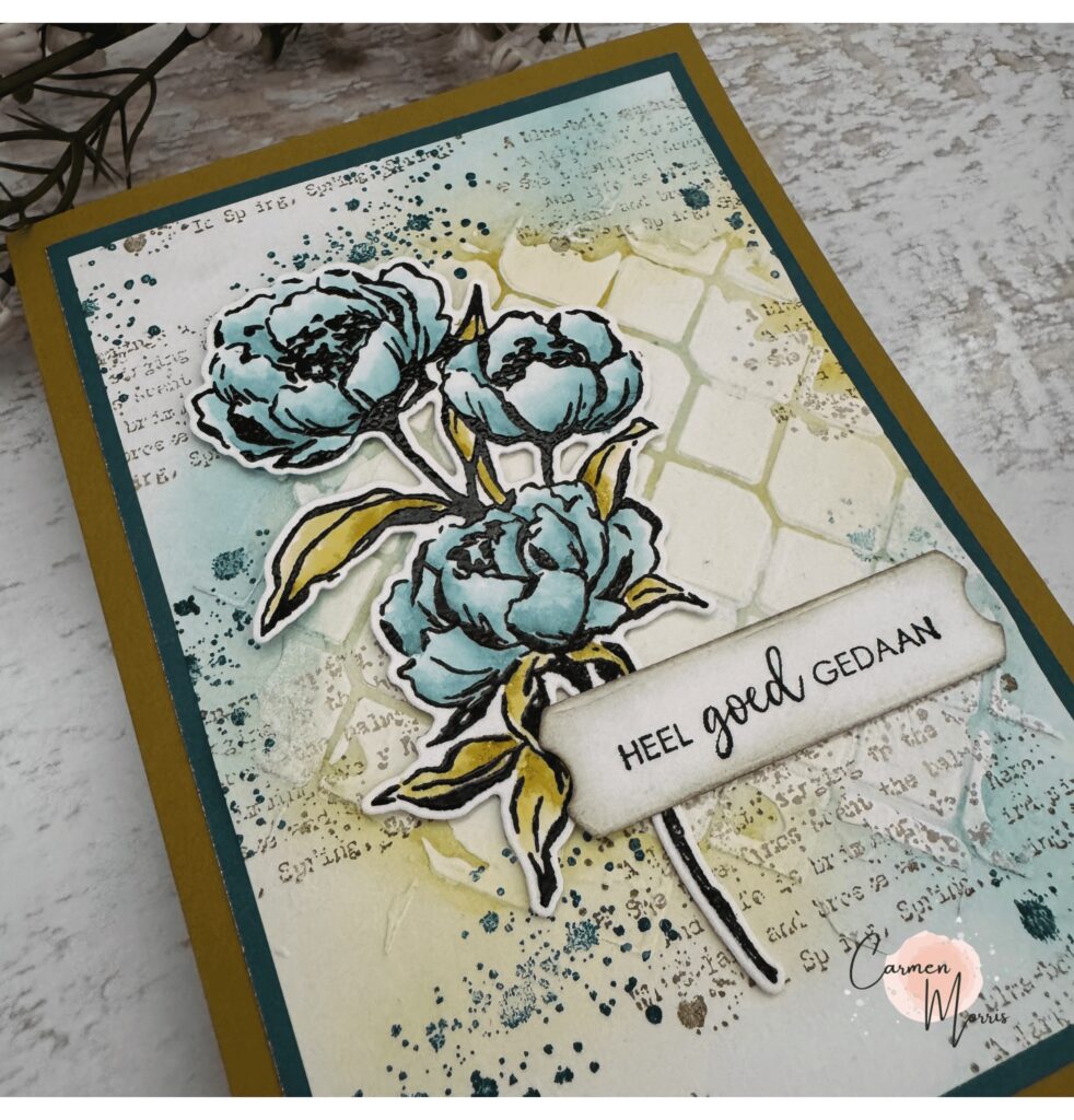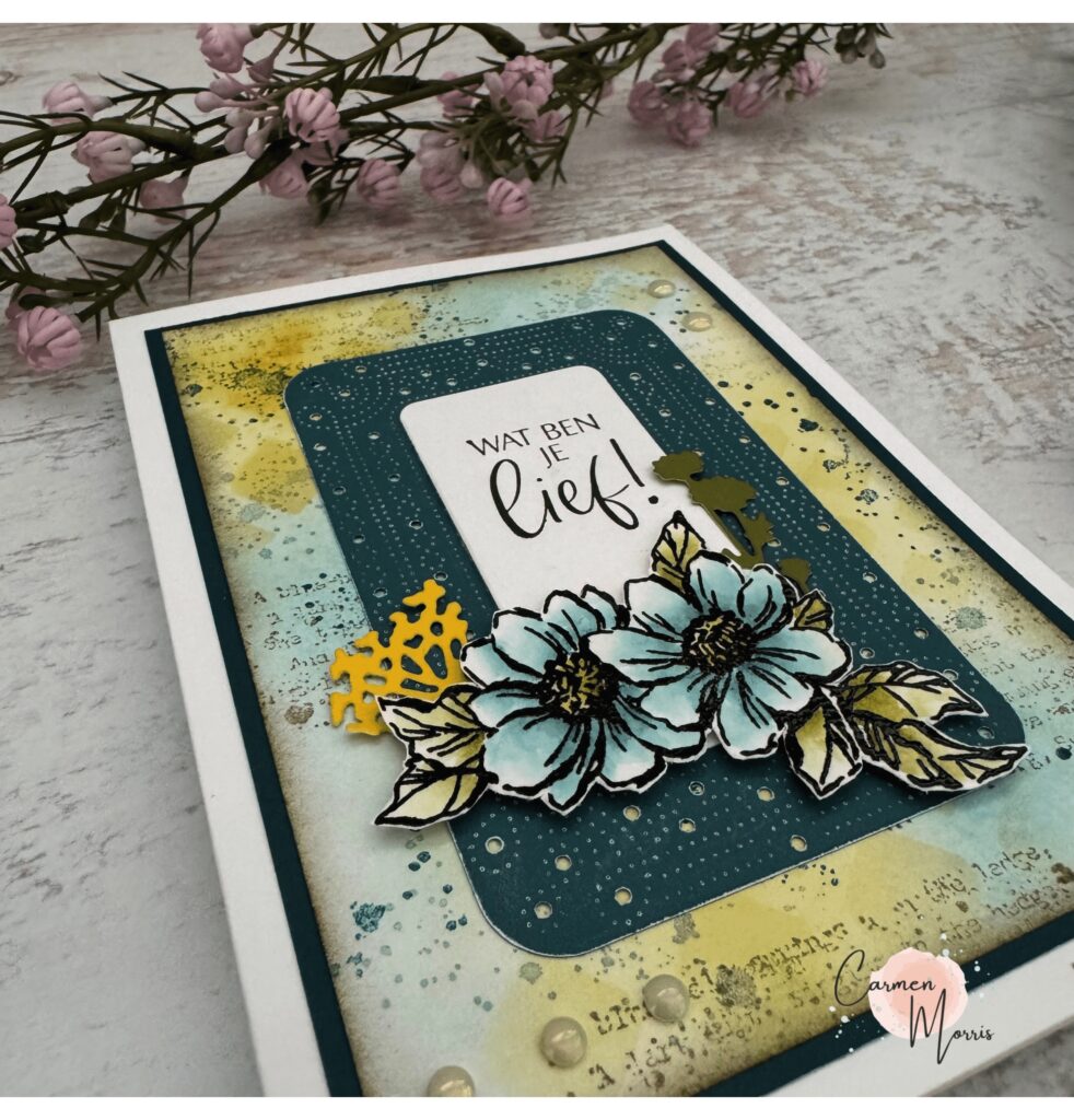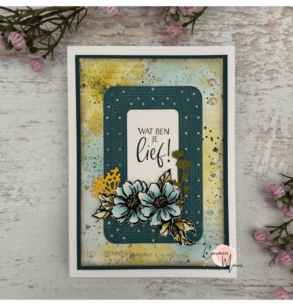 De stans komt uit de Sentimental Framing stansenset, de bloemen uit de Gallery Blooms stempelset en de tekt uit de set De Treffende Toon.