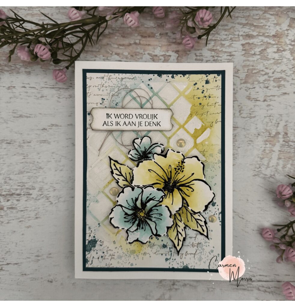De stempels komen uit de set Happy Hibiscus en de tekst weer uit de setDe Treffende Toon. De bloemen en bladeren heb ik dit keer uitgeknipt nadat ik ze heb ingekleurd met inkt van mijn inktkussen.